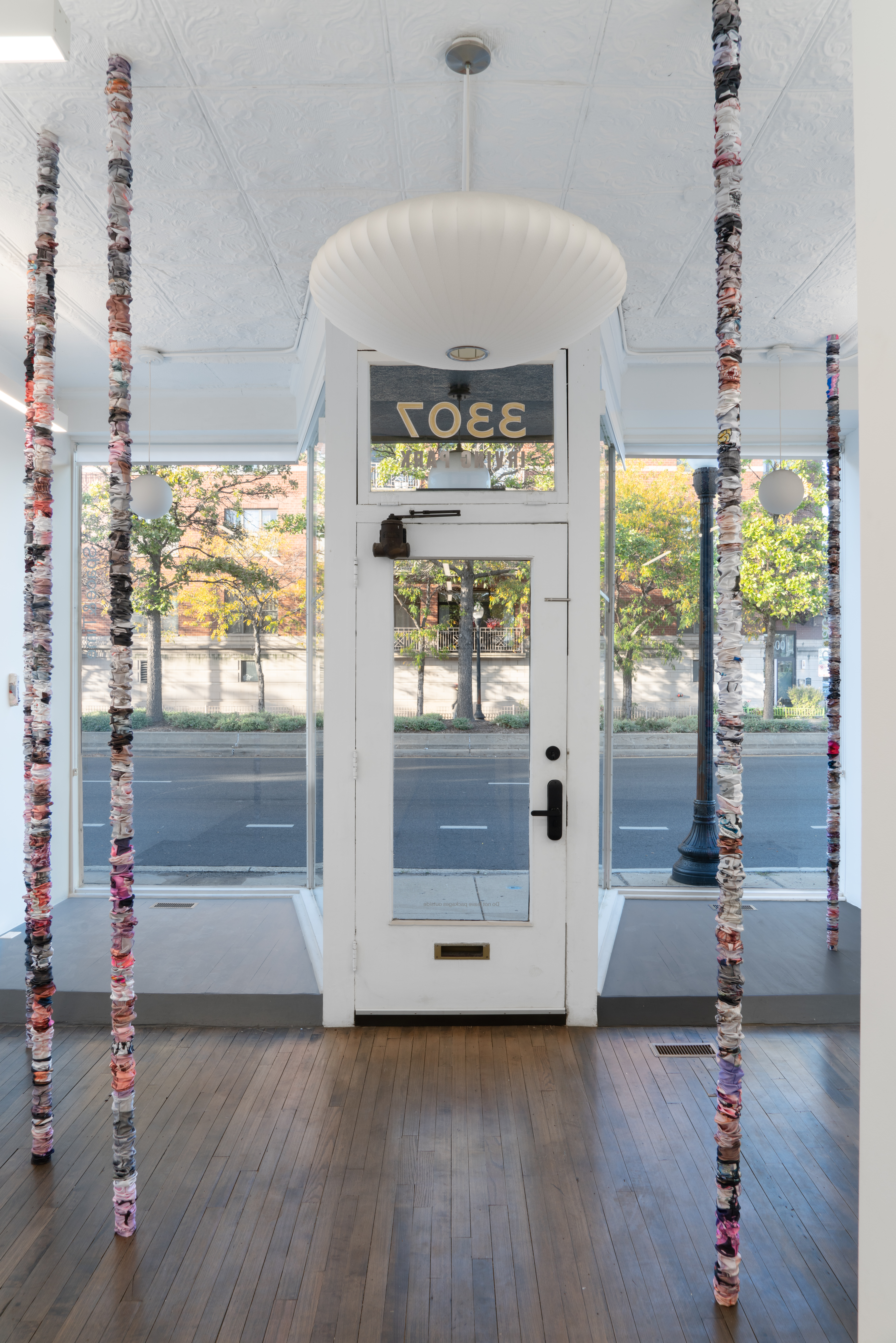 In a group of recent projects, André Marin and I have been searching for one or more matrix by which to process collected experience and material. André’s paper making and my satin ruching serve as capacities to hold—eccentric, irregular libraries in which to store a panoply of everyday miracles. The lacy, textured sheets André pulls from tubs of pulp that are akin to witchy vinegar mothers or sourdough starters function as systems of containment for mail order catalogs, receipts, handwritten notations, detritus from his various workplaces, and odd and end souvenirs. Likewise, this group of bâton works continues with a form latently referencing historical décor, specifically gathered fabric casings for the chains or cords from which chandeliers were hung, here printed with an inventory of images saved onto my phone—a forensics into my reflexes to screen capture, mood board, and twin with resemblances in my aesthetic dimensions.